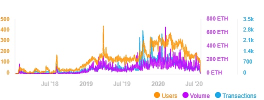 以上圖片來自dappradar的監控數據,這是轉賬次數、交易量和時間軸的對比。可以看出自2018年以來整體活躍度是上升趨勢不過近半年來反而是下降趨勢,像之前文章中說的一樣,NFT的市場不太成熟,跳躍性或者波動性很大,這如果不是目前世界排名前列的NFT交易所,而是一個項目方,這種圖形還有一個名字叫做“梳子線”,一般呈現梳子線的幣種,流動性不是特別好,整體市場行情跳躍,也就意味著風險很大。