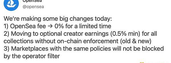 隨后,OpenSea史無前例地宣布撤銷其“支持創作者”的版稅執行政策進行反擊,并將市場交易費用暫時降至零。