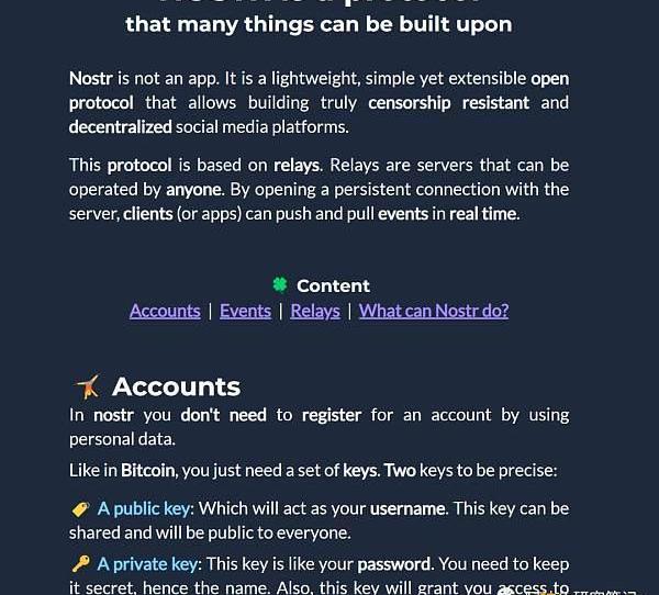 而NOSTR是一個協議,通過這個協議,可以建立很多東西,這個協議相對輕量級的、簡單但可擴展的開放協議,在它上面可以建立真正去中心化的社交媒體平臺。