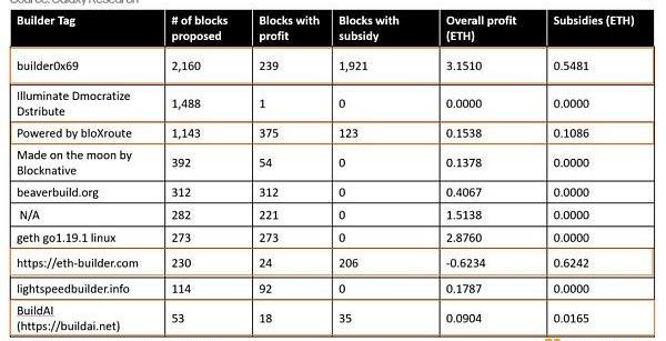 一旦構建者鎖定了一個有利可圖的區塊,他們就會計算一個包含在區塊中的出價,要么作為有利可圖的優先費用,要么作為區塊創建后從構建者直接轉移到驗證者的價格。出價越高,構建者越有可能看到其區塊被包含在鏈上。構建者之間的最后一場競爭是通過區塊補貼進行的。以太坊上至少有五個構建者提議的區塊出價高于區塊獎勵價值,這表明這些構建者正在以某種方式補貼他們的區塊。在每天提議區塊數量最多的10個區塊構建者中,有4個要為其區塊提供補貼。
