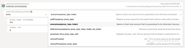 如果要刪除代理,extrinsic外部頁面上有幾個函數可以幫助你完成此操作。killAnonymous()函數可以刪除匿名代理。removeProxies()和removeProxy()都可以刪除任何其他類型的代理,但前者將刪除所有代理,而后者是刪除一個選定的代理。