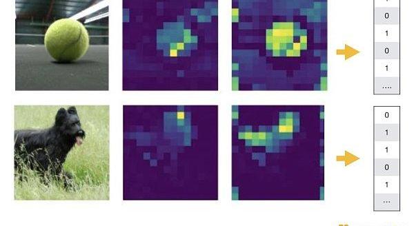 CLIP模型用到了兩個編碼器,視覺編碼器叫VisionTransformer,文字編碼器叫Transformer。下圖是VisionTransformer編碼器產生的效果圖,可以看到兩張圖片里背景部分的顏色被大幅弱化,強調了網球和黑狗的輪廓。這就是優秀的編碼器能實現的效果:用人類的視角找重點,進行數據降維。