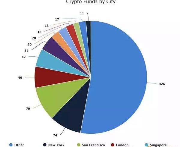 但當我們把目光放到城市上時,這個現象會更加明顯。根據Crypto?FundResearch數據,舊金山和紐約擁有世界上最多的加密基金(>70家),而倫敦、新加坡和香港以30-50家加密基金的數量位居其后,芝加哥、上海、洛杉磯、瑞士楚格、加州門羅帕克和圣莫妮卡則處于10-20家加密基金的第三陣營。在地圖上也能清楚地看到,加密基金在美國東西部沿海和西歐較為集中,部分位于東亞和東南亞,其他則分布在東歐、西亞和澳洲,而非洲與南美只有零星幾家。