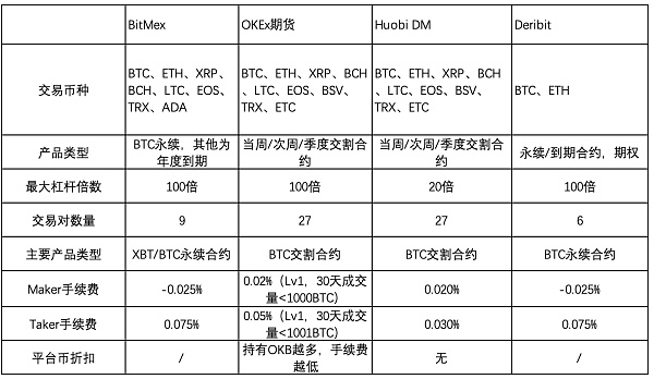 我們結合了在市場上綜合實力比較高的前幾家進行了系統的對比,分別是:BitMEX、OKEx、Huobi、Deribt。