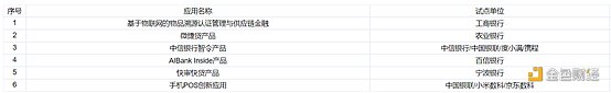 根據公示內容,該11個應用分別為:基于智能機器人的移動金融服務項目(工商銀行)、基于區塊鏈的產業金融服務(中國銀行)、5G+智能銀行(建設銀行)、普惠小微企業貸產品(北京銀行)、“一路行”移動終端理賠產品(中國人壽/中國人壽北京分公司)、多方數據學習“政融通”在線融資項目(騰訊云計算/北京小微企業金融綜合服務有限公司/浦發銀行北京分行)、天翼智能風險監控產品(中國電信/翼支付)、國網智能圖譜風控產品(國網征信/郵政銀行)、移動金融云簽盾(中金金融認證中心/民生銀行)、基于區塊鏈的企業電子身份認證信息系統(國家計算機網絡與信息安全管理中心、中關村銀行、百信銀行、民生銀行北京分行)、智能云小店服務(拉卡拉支付)。