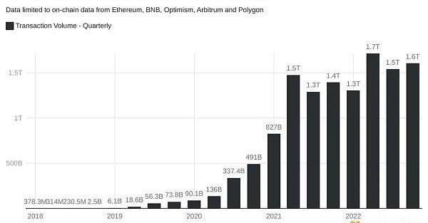 上圖是保守的一面。來自DAppRadar的數據表明,在2022年第四季度的某一天,累計DeFi用戶數量接近約300萬。這仍然低于2022年1月之前活躍在該領域的900萬左右的錢包數。從規模上看,Coinbase僅在美國就有約60萬DAU。現在我們不知道所有這些用戶是否每天都進行交易。然而,他們中的大多數人快速瀏覽他們的投資組合的可能性很高。