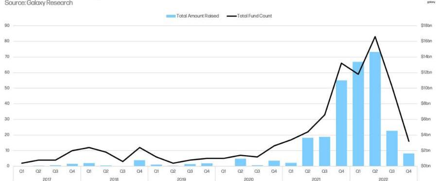 在當前的宏觀環境下,因為投資者對投資風險的重新考量或是直接撤資,導致投資機構籌集資金變得很困難,特別是伴隨著加密資產價格的下跌和市場的大動蕩,進一步加劇了這種困難,2022年Q4季度,無論是加密VC基金的數量還是加密基金籌款總額都創下了近兩年來的新低。