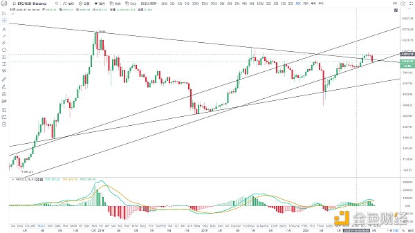 昨日晚間一波探底回升,價格突破小時下降三角壓制,最高沖至10440美金附近在回落,不過調整量能一般,屬于突破回踩的健康走勢,并且近期日線接連下插針,顯示階段抄底買盤的強勢,短期5日均線也由下降轉為走平姿態,空頭量柱0軸下方逐步縮短,表明近期再次大幅下砸的可能性不大,短期止跌企穩迎來反彈的概率大,BTC自前期12000美金上方一路砸下來,期間并未出現像樣的反彈,目前行情止跌周線布林中軌以及120日均線的共同支撐區域,日線連續下影線,并且周線MACD指標線即將死叉,往往這個時候就會出現一波爆空反彈,預計近期還是以反彈為主。