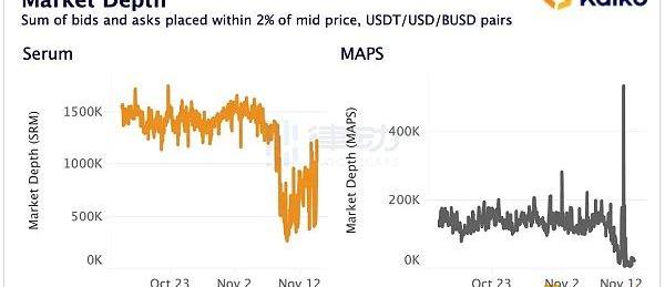 同樣的,SRM和MAPS的深度也出現了巨大的下降,這表明做市活動已受到Alameda暴雷的嚴重影響。