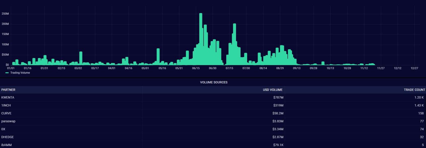 據Synthetix官網數據顯示,在原子交換完善后的一個月,Synths資產現貨交易量在以太坊主網暴漲至最高2.55億美元。今年以來,以太坊主網上Synths現貨總交易量僅Kwenta和1inch相加就超過了10億美元,SNX的價格也在年中經過過一波不錯的上漲。