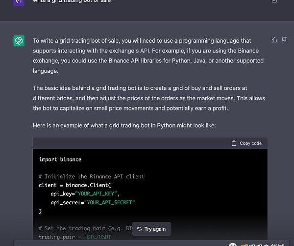 我們嘗試在Input區域輸入一個具體的需求,例如“writeagridtradingbotwithbinanceAPI“,我們就可以得到如下Python版本的一個網格買入代碼模板,仔細看看,并沒有什么明顯的bug,屬于不用改就可以用的程度。但是需要注意的是,哪怕每次輸入的命令是一樣的,但是得到的代碼版本也是不同的,不過對于同一個問題,chatGPT給出的思路都是一樣的。