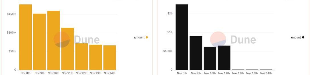根據DuneAnalytics的數據,截至11月8日,屬于FTX和AlamedaResearch的錢包總額分別為17.5億美元和1.773億美元。11月14日,兩個錢包的凈值均大幅縮水,分別縮水94%和69%。