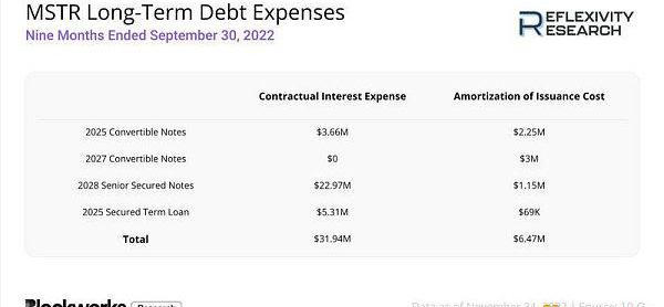 在截至2022年9月30日的九個月里,MSTR所有值得注意的未償還長期債務的合同利息支出和攤銷的發行成本可以在下表中找到。在這九個月中,Microstrategy為以下四種債務工具支付了大約2200萬美元。