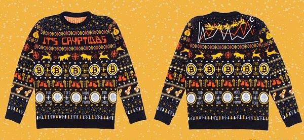 有句諺語叫:沒有丑毛衣的圣誕節是不完整的。那么,相信由Notjust推出的這款毛衣一定與圣誕氛圍相當契合。這款毛衣的印花非常具有特色:BTC和ETH圖案與圣誕特色圖案相互碰撞、圣誕老人則駕著他的雪橇奔向月球。相信這件毛衣一定會在這個圣誕假期引發大量有趣的話題。