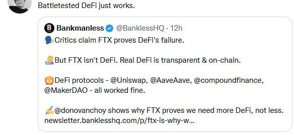 "有了DeFi就不會發生這種情況"。"這就是為什么我們需要遠離中心化的交易所,轉向DeFi的原因"。"FTX的問題是CeFi的,不是DeFi的"。