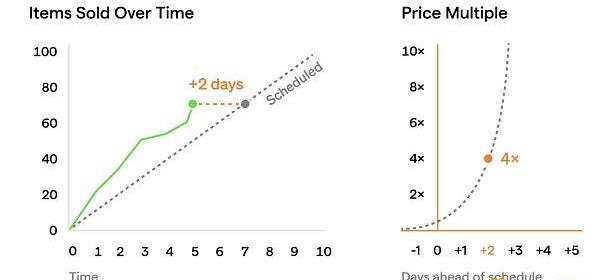 在ArtGobblers這個項目當中,Gobbler以及頁面的發行就是采用了VRGDA方式來進行競拍。簡單來說,就是當市場需求過高導致銷售提前時提高競拍價格,而在市場需求下降導致銷售落后時降低競拍價格,這種根據市場供需關系動態調整定價的方式,為市場提供了一個復雜的博弈空間。