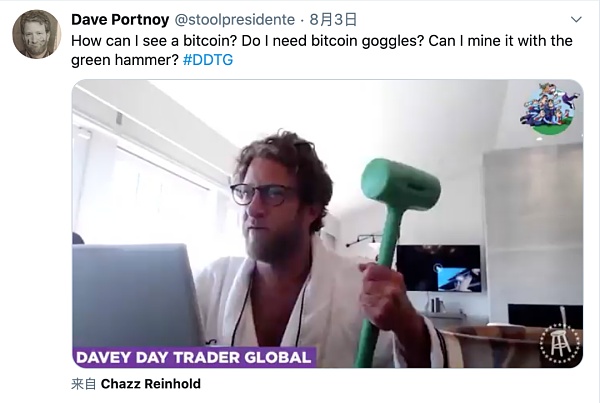 XRP/HKD-3.48%Dave Portnoy是活躍在Twitter平臺上、因今年直播股票交易而大受歡迎的網紅交易員。他8月13號的視頻談到了比特幣,這次,他半認真半搞笑地問“我怎樣才能看到比特幣,用這個綠錘子能挖到么?”
