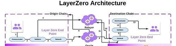 LayerZero是通用互操作性解決方案之一,也是第一個沒有自己的原生共識系統的跨鏈協議。“Omnichain”網絡通過使用兩個獨立實體連接不同鏈上已建立的端點或智能合約來發揮作用:預言機和中繼器。預言機是第三方服務,負責從源鏈獲取區塊信息并在目標鏈上廣播這些信息。而中繼器是鏈下實體,負責在鏈A和B之間傳遞交易證明以確保交易的有效性。這種將中繼器與預言機分離的模型使得協議只有在這兩方相互勾結時才會受到惡意活動的影響。