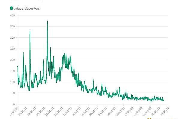 從以上圖表中我們得知,自2021年11月以來,跨鏈存款人的數量一直呈下降趨勢。與2022年8月的鏈上分析相比,業內最成功的替代L1Polygon、BSC和Avalanche,其每月存款人分別減少了約42%、86%和95%。
