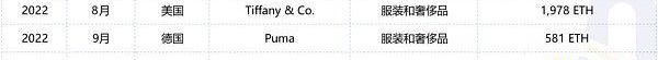 在列表中的51個品牌中,19個品牌(37%)來自服裝和奢侈品行業。自2021年12月推出以來,阿迪達斯憑借其“AdidasOriginalsintotheMetaverse”NFT系列引領該行業,迄今為止的總交易量為47,000ETH。耐克、Dolce&Gabbana和Gucci緊隨阿迪達斯之后,其中交易量更高該領域的其他品牌。Puma的NitroToken和Nitropass以及Tiffany&Co的NFTiff系列是服裝和奢侈品行業品牌于2022年8月推出的最新產品。