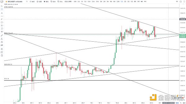 從BTC技術圖形上看,目前日線也是一個整理三角的姿態,走勢和之前10000-9000美金區間三角收斂類似,前一次BTC在三角末端向上突破,價格從9200美金一路拉升至12000美金上方,區間漲幅超過30%,而本次末端極限變盤日期在9月25日附近,昨日的一波強勢下殺,價格剛好從三角上軌砸至下軌支撐,觸碰后價格快速拉起,日線下插針姿態,前期日線多次插針均能快速回升,驗證了該趨勢線的前支撐作用,只要不有效跌破,BTC近期整體依舊是區間整理的姿態,近期的上拉下砸都是在醞釀后續的變盤行情。