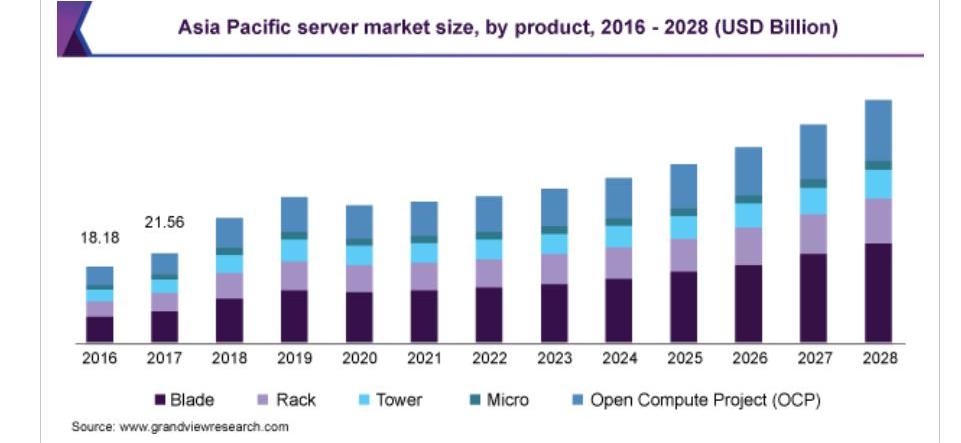 根據grandviewresearch的研究,2020年全球服務器市場規模為836.6億美元,預計從2021年到2028年將以7.8%的年復合增長率增長。增長的原因主要來自于全球新數據中心數量的增加,包括一些云服務提供商和行業,如IT和電信,醫療保健,BFSI以及政府和國防,正在升級其服務器以管理不斷增長的數據量,因為IT基礎架構的升級為管理更高的數據量提供了增強的安全性、存儲和處理速度。