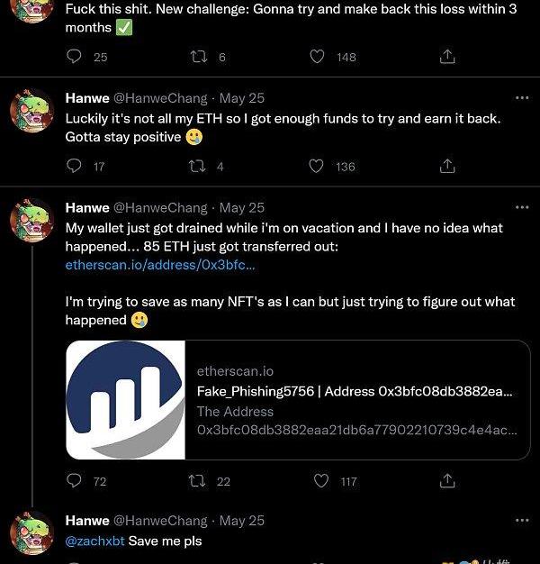 加密錢包被盜事件越發頻繁,方式層出不窮,防不勝防。5月底,一個叫Hanwe的NFT玩家由于電腦中了木馬,被盜走了85ETH。