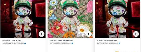 去年GUCCI與Superplastic合作推出了SUPERGUCCINFT系列,具體玩法上,Superplastic將旗下數字形象Janky&Guggimon整合GUCCI經典ICON打造成NFT及相對應的陶瓷潮玩公仔。