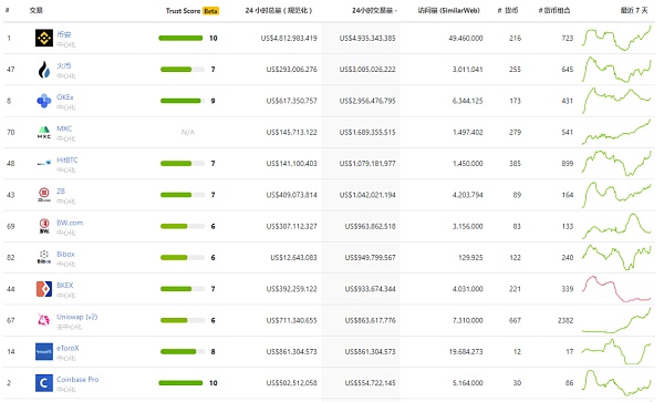 這就是去中心化交易所(DEX)的交易數據,24小時交易量達到了10億美金。我們再去回過頭看一下中心化交易所的情況。