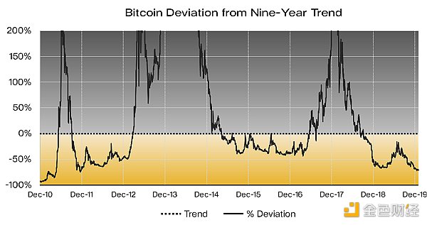 比特幣價格曾經歷過八次繁榮和蕭條——有時波動較大,有時波動較小。如果我們按“年度”來分析并觀察價格時,基本上持有比特幣三年零三個月的投資者都沒有虧錢。根據比特幣指數增長指標,過去九年比特幣價格表現其實比較穩定,復合年增長率達到了215%。