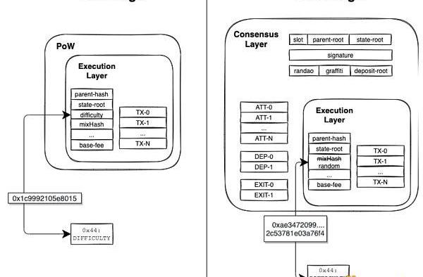 合并前,我們看到0x44操作碼返回區塊頭里的difficulty字段。合并后,負責生成隨機數的RANDOM操作碼則指向原有mixHash字段,該字段被重名為random。