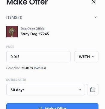 用戶點擊可以選擇立刻以固定價格或者出價的方式來購買NFT。當選擇以固定價格購買,首次購買的用戶會彈出接受服務條款的對話框,用戶點擊確認繼續購買即可;當選擇為NFT出價,用戶需要點擊「MakeOffer」進入出價操作頁面,用戶選擇出價金額和到期時間即可,報價是以WETH來計價的。如下圖所示,為編號7245的StrayDog出價,金額為0.015WETH,到期時間為30天。