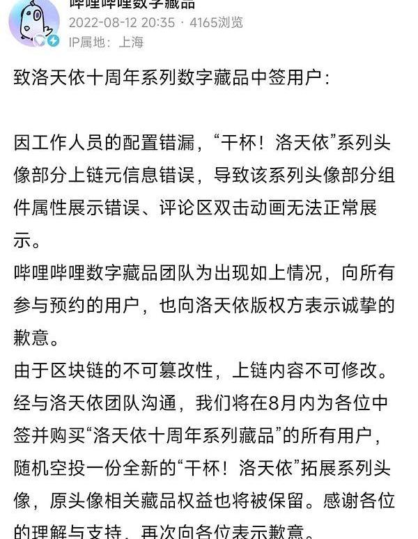 當天下午,“嗶哩嗶哩數字藏品”官方賬號發布聲明稱,因工作人員配置錯漏導致該系列部分組件屬性展示錯誤、雙擊動畫特效無法展示,而區塊鏈信息無法修改,因此將對購買這款藏品的用戶在8月內空投全新的“干杯!洛天依”藏品進行補償。