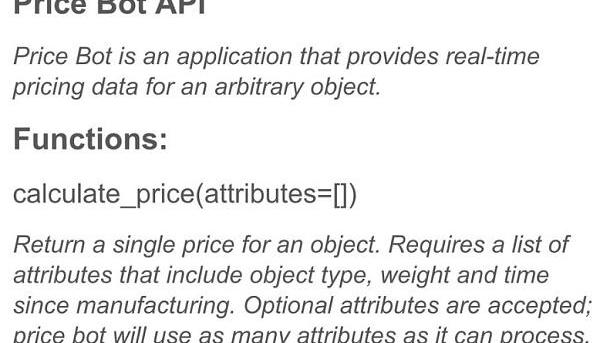 這就是價格機器人的API:一個價格機器人支持的函數列表和如何使用他們的說明。這是一個示意圖,由此開發者可以在無需掌握應用程序的情況下集成它。假設這個例子是真實的,那么這個API的文檔應該是這樣的: