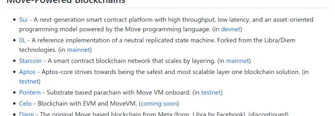 據Sui開發團隊MystenLabs撰寫的介紹Move語言的文檔,目前有4條公鏈已經使用Move語言,分別是Aptos、Sui、Starcoin、0LNetwork。