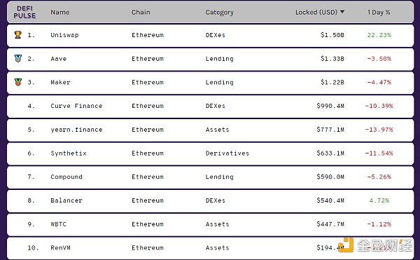DeFi項目鎖定資產前十排名及鎖倉量,數據來源:Defi Pulse