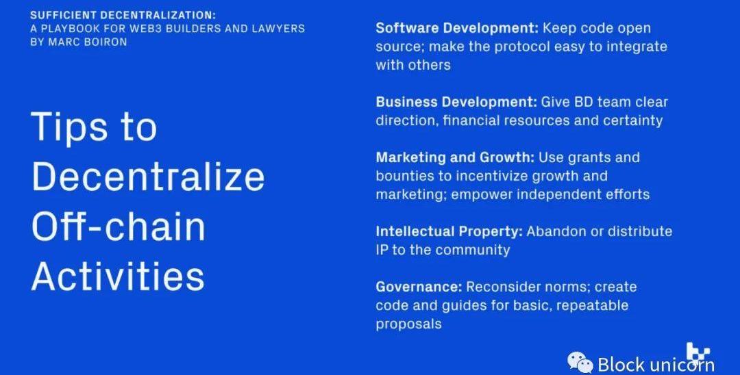 然而,協議的技術及其自主操作可能并不總是驅動給定加密資產價值的唯一合理因素。那些合理期望從加密資產中獲利的人可能會認為附加的鏈下活動是價值驅動的。因此,為了減少任何Web3參與者的風險,社區還應尋求去中心化鏈下活動,包括以下方面: