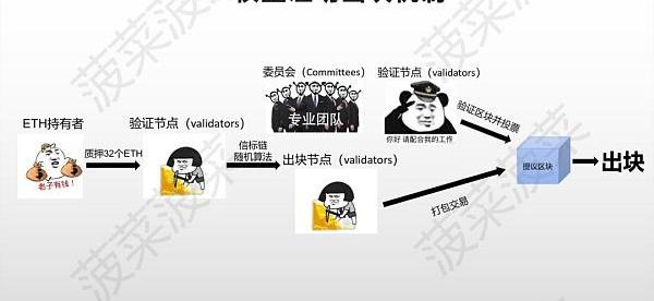 關于出塊時間。在工作量證明下,區塊的時間由Mining難度決定,而在權益證明中,速度是固定的。權益證明以太坊的時間分為插槽和周期,這決定了系統中共識的節奏。即每一隔12秒出一個插槽,每個周期包含32個插槽,即每隔6.4分鐘產生一個周期,每個插槽只能創建一個有效區塊,每個插槽中隨機選擇一個驗證者作為區塊提議者,該驗證器負責創建一個新分片區塊并將其發送到網絡上的其他節點。