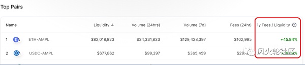 別小看這個哈,今年IUO(首次uniswap發行)的熱潮也順帶帶起來超高的做市年化收益,像現在給eth-ampl提供流動性,年化收益在45%,之前ampl大熱的時候,年化能做到400%!