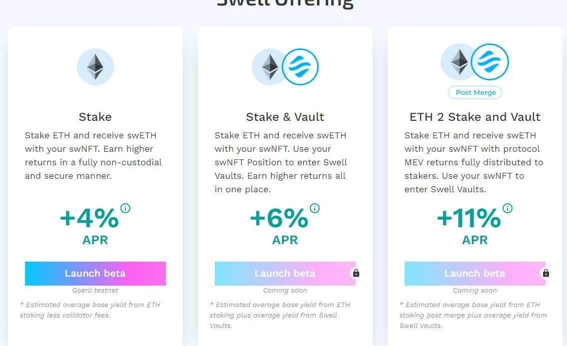 SwellNetwork是一種無需許可、非托管的ETH質押協議,專為質押者、節點運營商和以太坊生態系統構建。Swell于今年6月16日宣布與SSV達成合作,將優先整合ssv.network在分布式驗證器技術方面的進步,有助于更好地管理風險、提高驗證器性能。目前其Goerli測試網版本已經上線,TVL達到286ETH,年利率為4.2%。