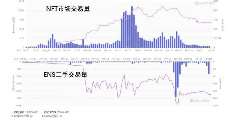 考慮到ENS域名的特殊性,具備交易屬性的域名在總體域名市場的比例較小,且買賣很依靠“緣分”。不過在NFT交易市場交易量不斷萎縮的當下,ENS域名成交量呈現逆勢上漲趨勢。
