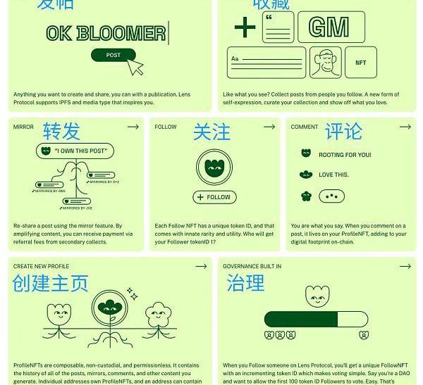 內容、數據所有權通證化:以NFT為核心構建關系,多個NFT的相互作用呈現關注、轉發、收藏等社交行為,構成圖譜。用戶可以自主控制這些NFT的所有權,例如轉出、售賣或者參與治理,并且可以帶到任何基于Lens協議構建的應用程序中,數據遷移更具優勢。