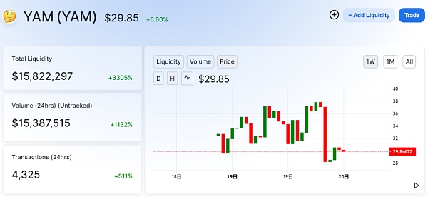 YAMV3 在 Uniswap 上的流動性資金達到了1582萬美元,YAMV3 的價格波動也非常大,在 YAMV3 開始挖礦后,價格也出現了跳水現象。