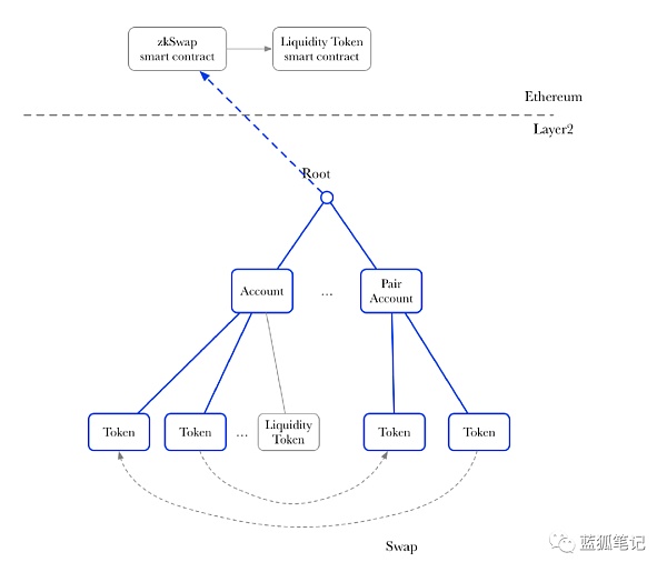 不過,它并不是鏈上的代幣轉移,因為代幣還在ZeroSwap合約中。用戶在Layer 2上進行交易,它本質上是用自己的代幣與Layer 2中代幣對資金池中的代幣進行兌換。用戶將其在ZeroSwap賬戶下的某個代幣發送到相應的代幣對賬戶,ZeroSwap則根據AMM算法計算出用戶可以獲得的相應代幣的數量,并發送給用戶賬戶。