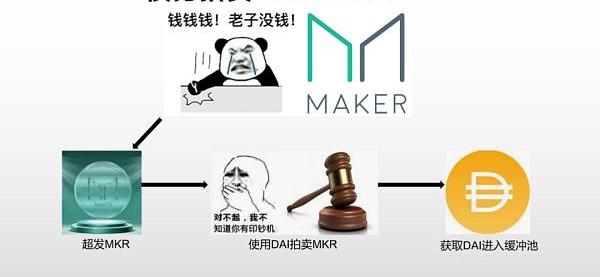 債務拍賣機制:當緩沖池中的DAI不足以償還Maker債務時,Maker協議將會超發MKR來啟動拍賣程序,拍賣者可以使用DAI拍賣獲取MKR,拍賣獲取的DAI將進入緩沖池去償還債務。