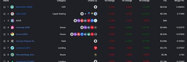 MakerDAO是一個運行在以太坊區塊鏈上的、集超額抵押穩定幣、借貸、存儲、用戶共同治理和發展的項目,MakerDAO最核心的就是Maker協議,又稱多擔保DAI系統,可以讓用戶使用經過協議批準的資產作為擔保物來生成去中心化穩定幣DAI,截止至2022年7月26日,MakerDAOTVL為$8.03B穩坐DeFi王者寶座。