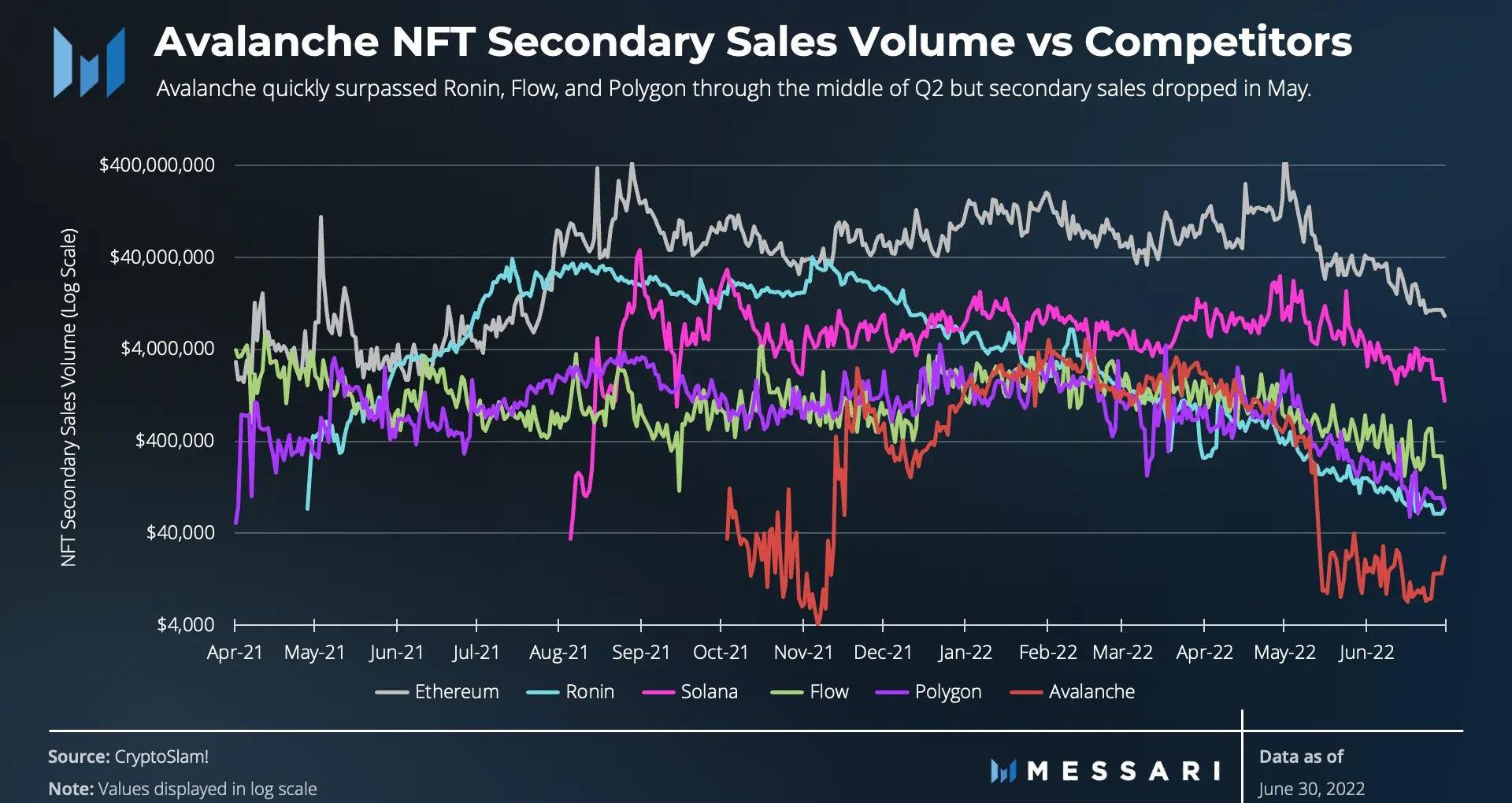 Avalanche的二級NFT銷量在第一季度和第二季度初期超越了Ronin、Flow和Polygon。然而,在Swimmer網絡子網發布前后,5月份的二級銷售有所下降。盡管如此,Avalanche還是在短時間內進入了歷史銷量前10名。