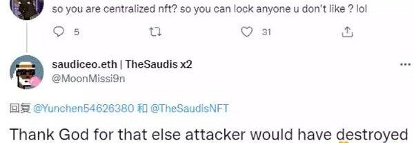 在TheSaudis這條推特的評論區,部分圍觀群眾紛紛留言表示這“太過于中心化”,他應當享有“交易自由”,而對于這些言論,一些用TheSaudisNFT當作頭像的網友給出了如下回覆: