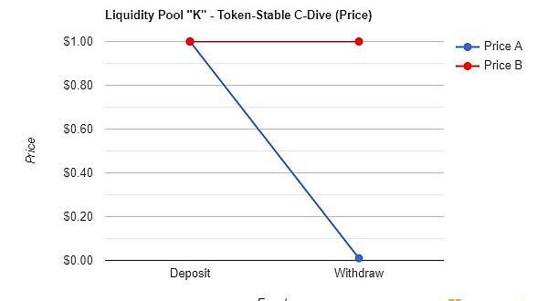 由于投資者希望在A上持有一個多頭頭寸,因此如果價格貶值,他們可以簡單地撤回其流動性池代幣K。在此示例中,當代幣A達到0.01美元的價格點時,投資者退出,留下5000代幣A和50個穩定幣B。