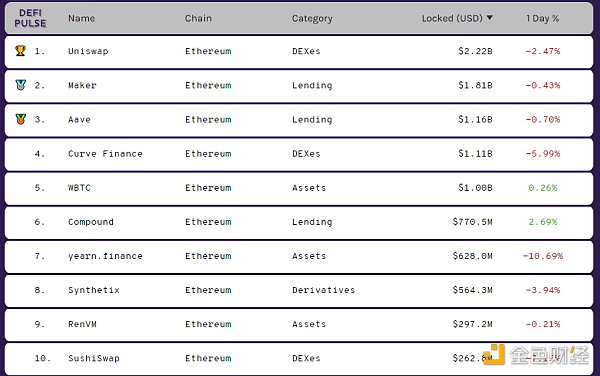 DeFi項目鎖定資產前十排名及鎖倉量,數據來源:Defi Pulse